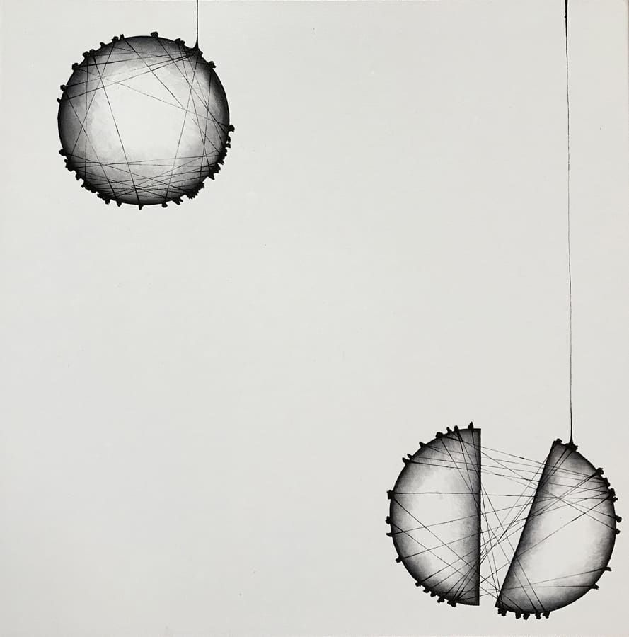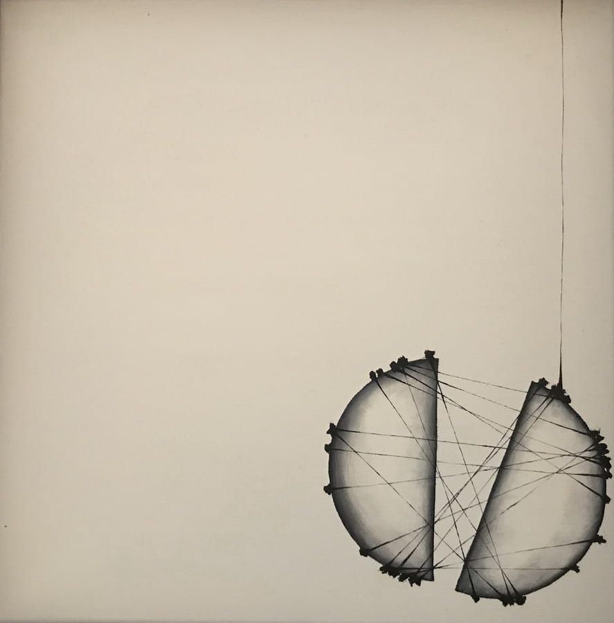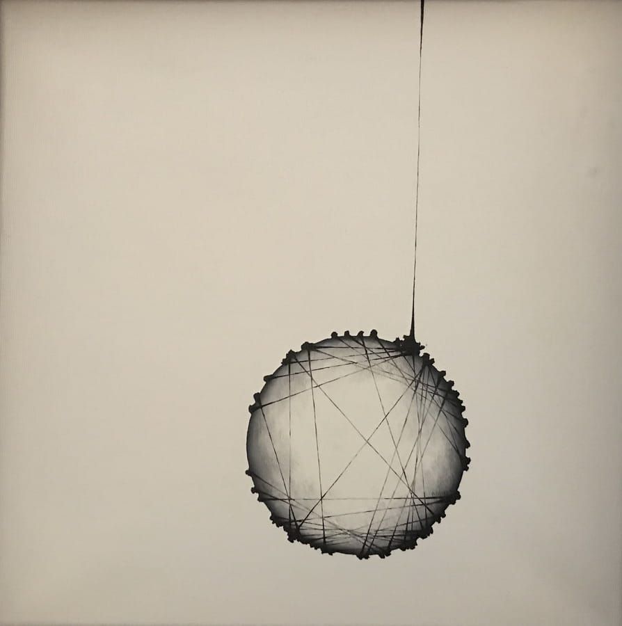 La piccola serie degli equilibri si lega sempre ai nodi, sono sfere intere e spezzate tenute insieme da alcuni fili che si attorcigliano e si aggrappano alla superficie delle forme. L’equilibrio è ciò che ognuno di noi va cercando, ma che ha in sè dei rischi continui, si cade, ci si ferisce, ma c’è un filo, che porta all’infinito, che ci tiene su, sempre ed immancabilmente. Si tendono fili (rapporti), più o meno fitti, ci si aggrappa ad ogni cosa, si cerca di stare a galla e, guardando verso il filo che ci tiene su, si cerca di risalire e poi di salire in alto per restare in equilibrio.