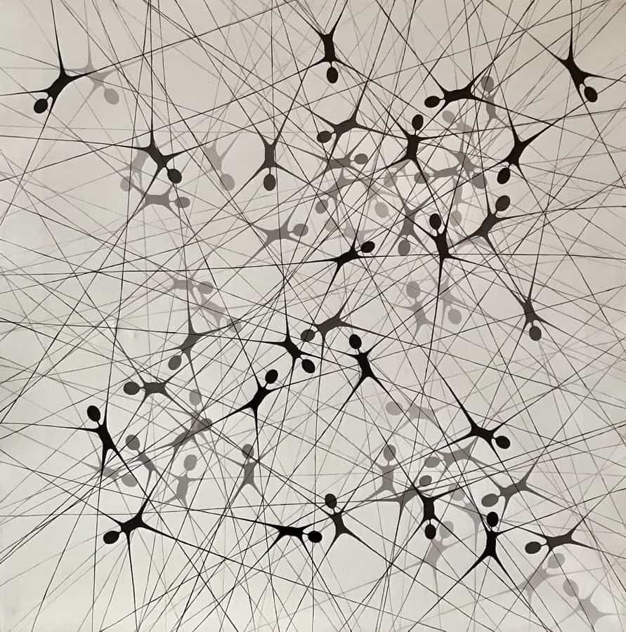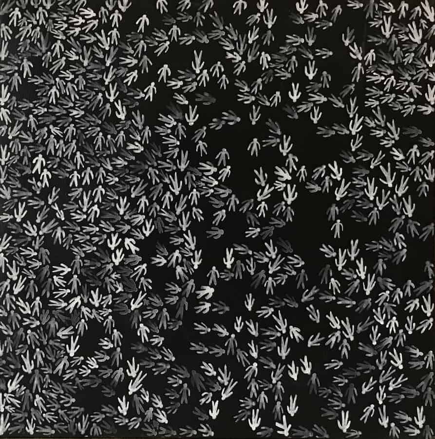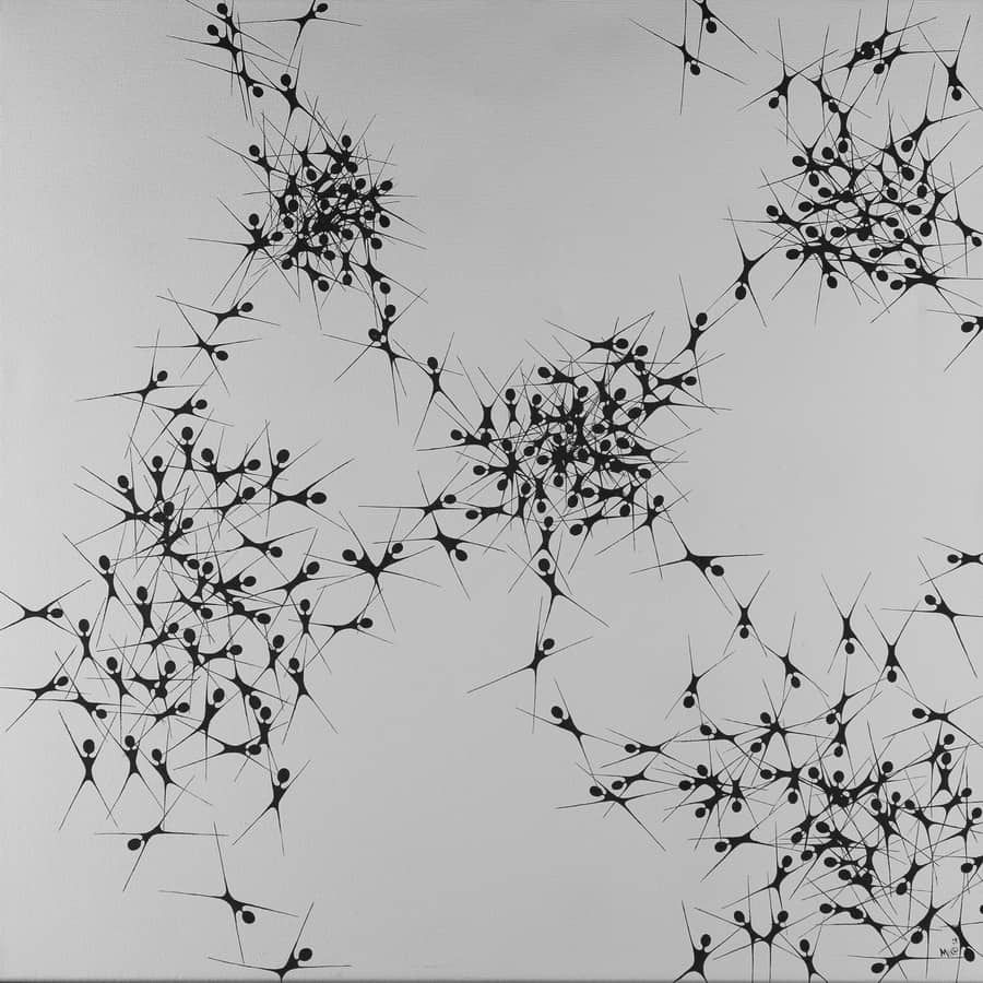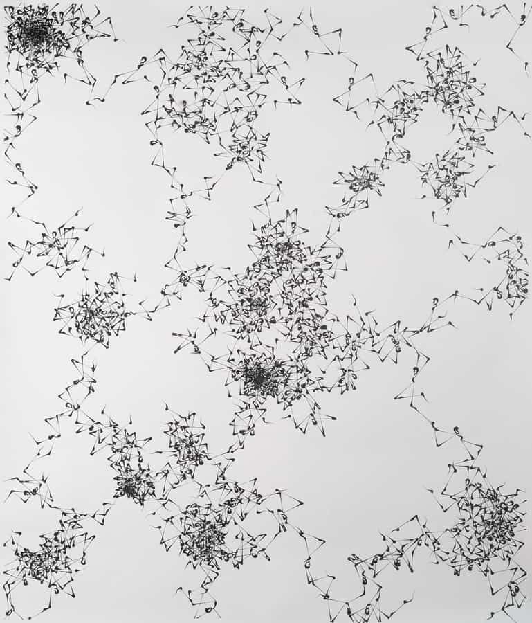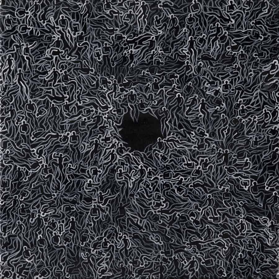 Sulla superficie bianca, matasse di nere silouettes, si aggrovigliano e dipanano creando un movimento concitato, parossistico; incontro e scontro di omini urlanti che sembrano uscire impazziti da un formicaio distrutto dal piede di un bambino dispettoso che ne ha sconvolto l’ordine.