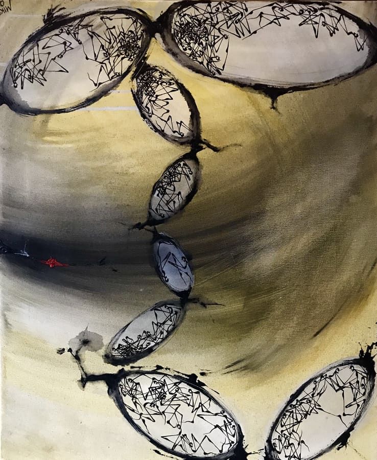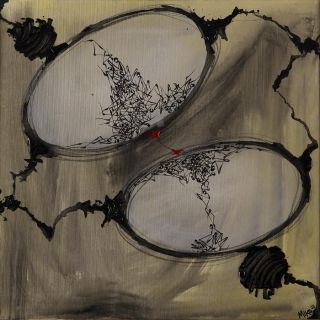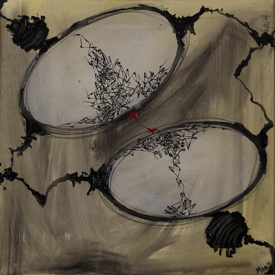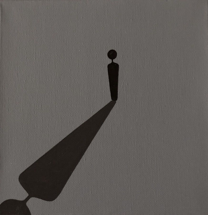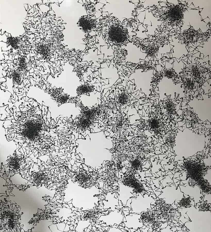 Sulla superficie bianca, matasse di nere silouettes, si aggrovigliano e dipanano creando un movimento concitato, parossistico; incontro e scontro di omini urlanti che sembrano uscire impazziti da un formicaio distrutto dal piede di un bambino dispettoso che ne ha sconvolto l’ordine.