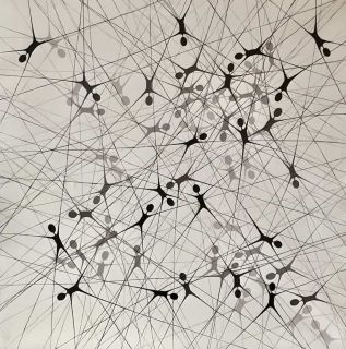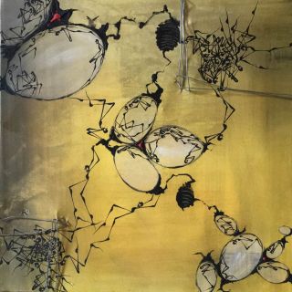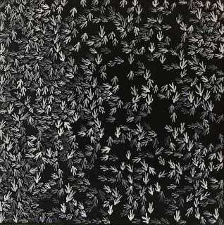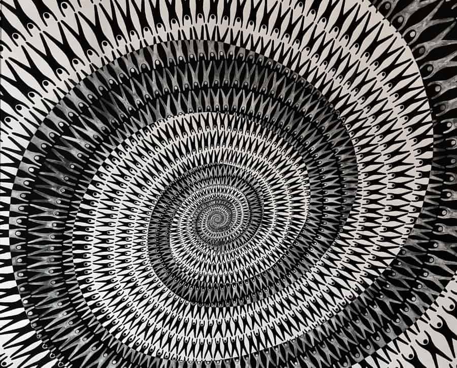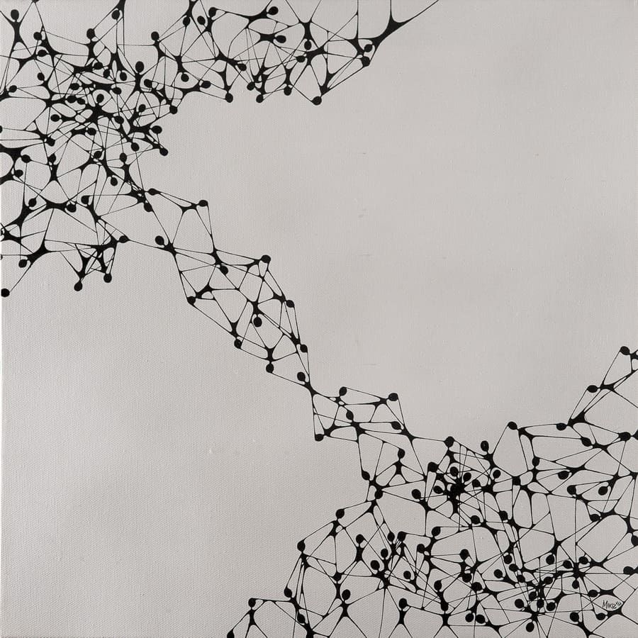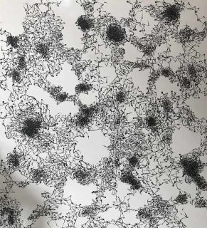 Pittura ed illustrazione si congiungono in una sintesi stilistica e le forme stilizzate di queste creature determinano, nell’incrocio dei segni e nella loro continuativa ripetizione, quasi una trama astratta nella quale la dimensione cromatica è ridotta all’essenzialità del bianco e del nero.